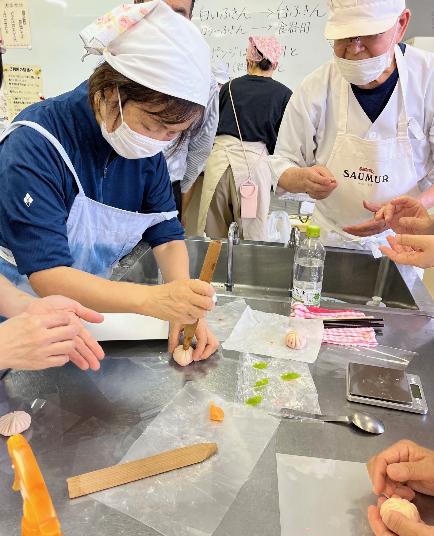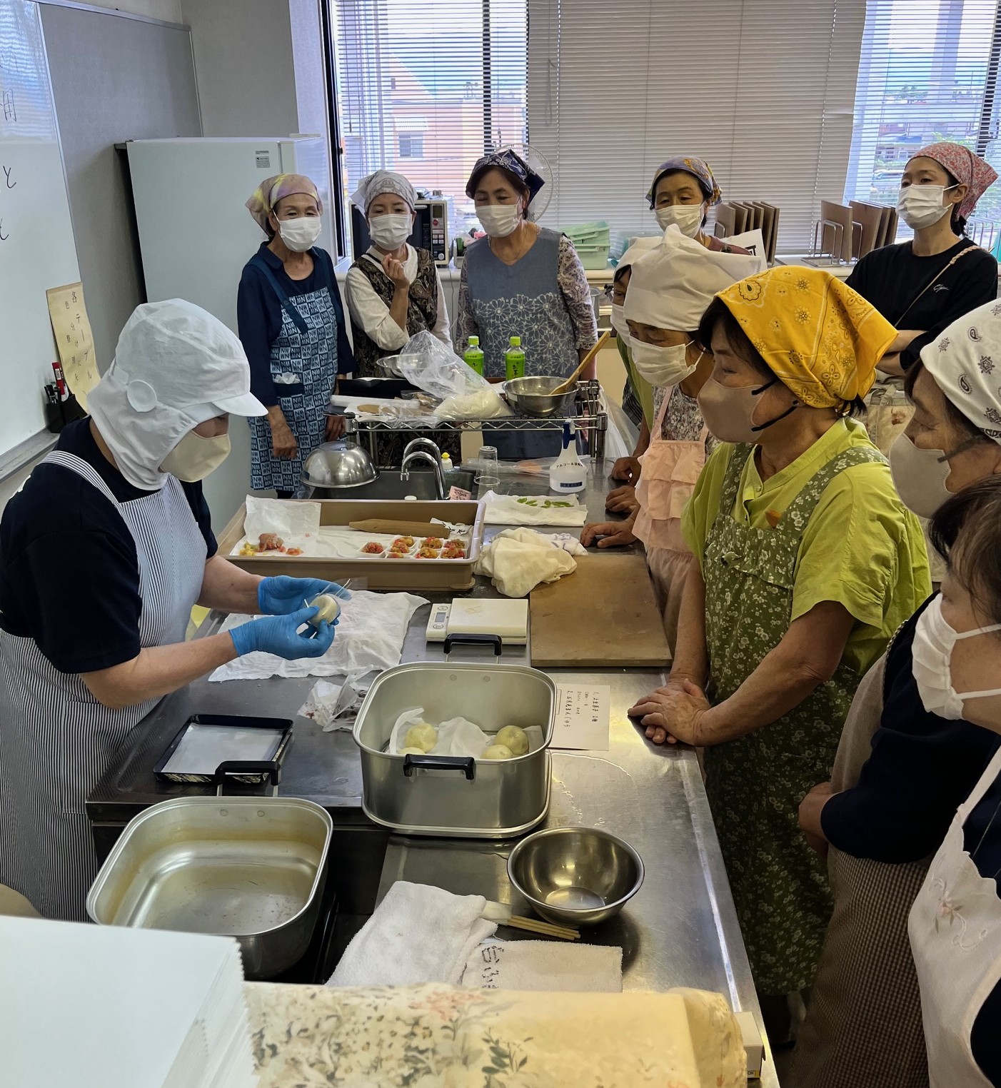 今年は春と秋の2回、地元老舗の和菓子店「旬彩菓たむら」さんを講師に呼んで、季節の和菓子作りを開催しました。 今回は『秋の和菓子作り』と題して、たむら会長の田村康博先生と職人の吉澤智子先生に、「蒸し饅頭」「練り切り2種」を教えていただきました。 24名の生徒さんに参加いただき、2時間で3種のお菓子作りを工程を無事終えることができました。 職人さんが、普段あまり目にすることのない道具を使うのを見たり、4人グループそれぞれ協力しながら、和気あいあいと賑やかな会になりました。 |