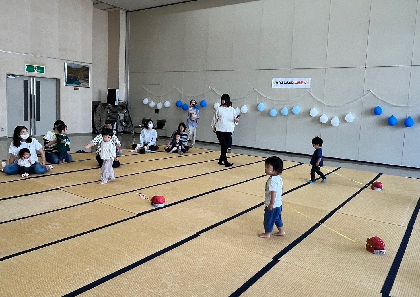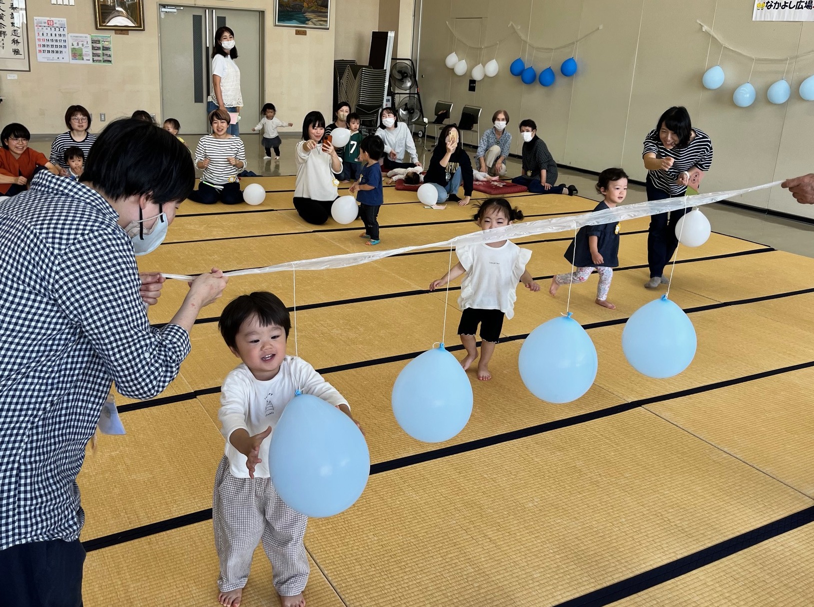 | 10月のなかよし広場はこの時期恒例の「ミニうんどう会」を行いました。 牛乳パックを使った応援グッズ「パタパタカスタ」を作った後、準備体操と紙芝居を見て、いよいよ運動会の始まり♪ 「ボール運び」「はたひろい」「ぺったんツリー」「風船とり」と親子で元気に楽しみました |