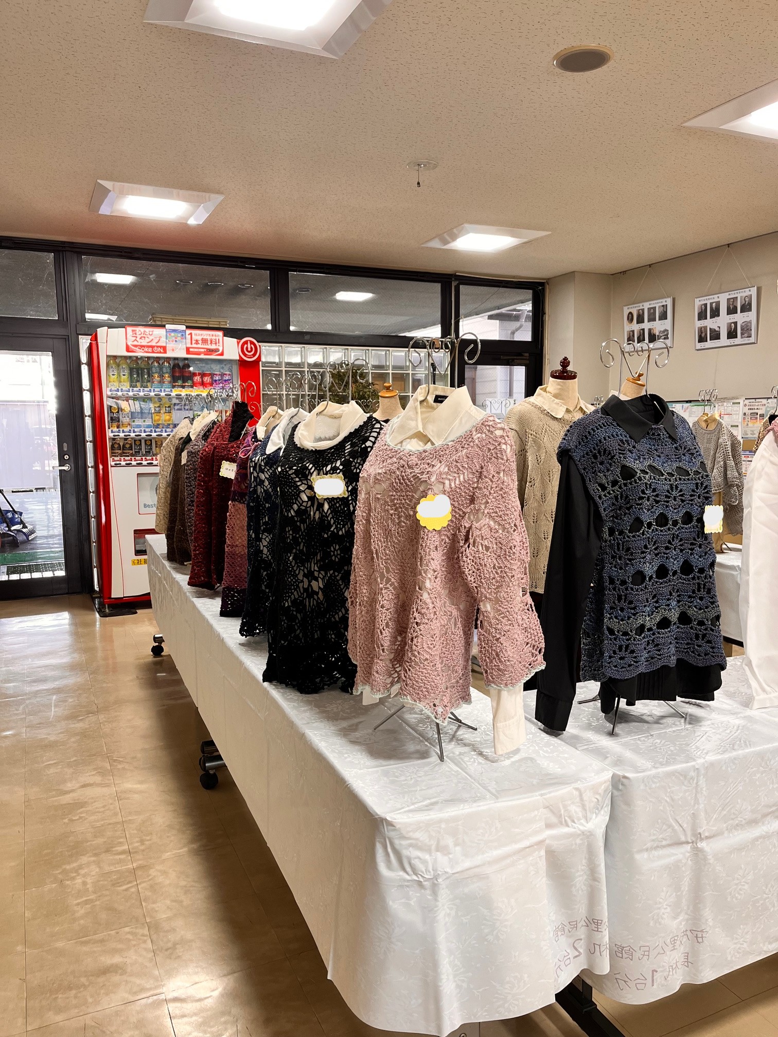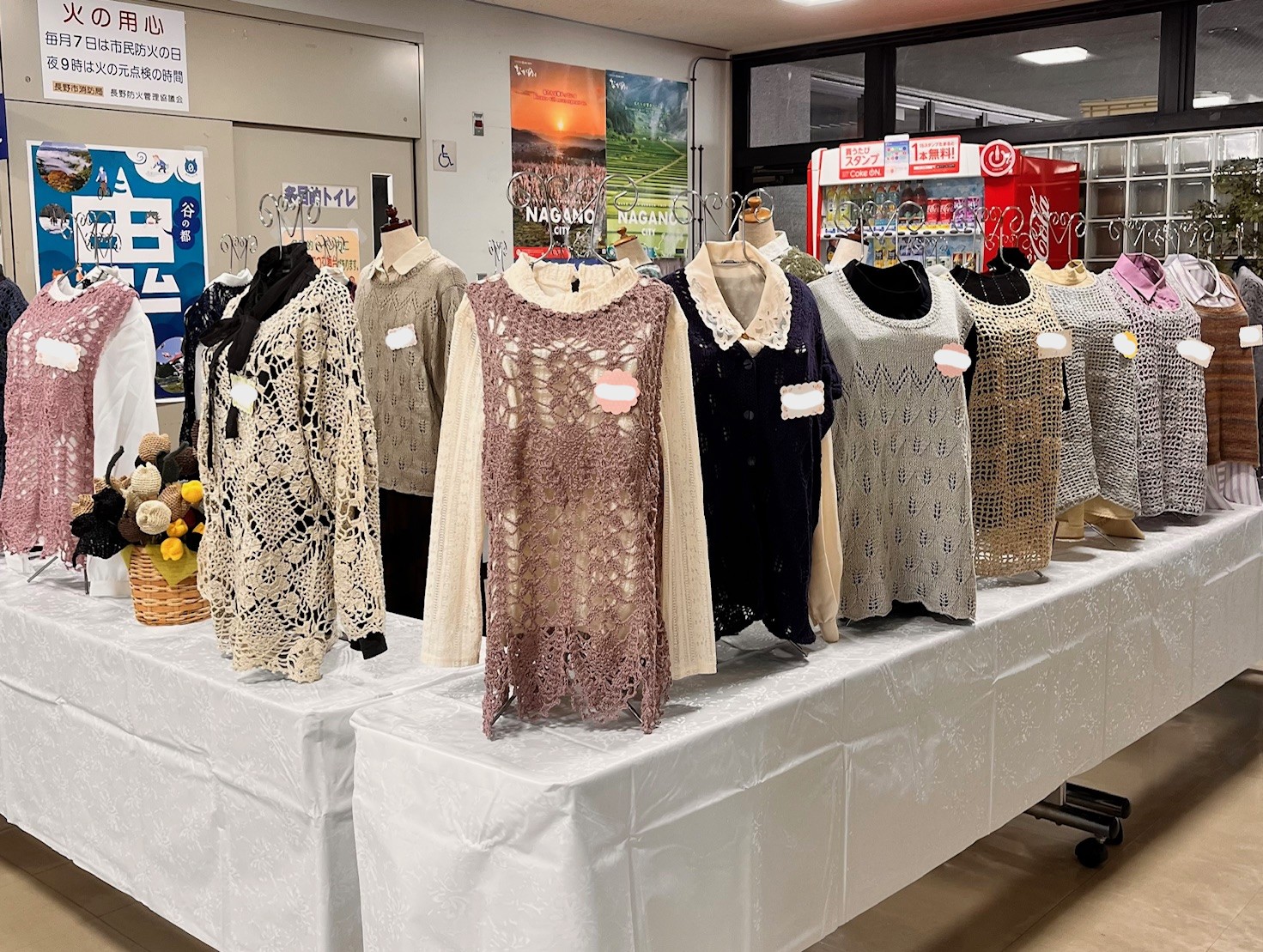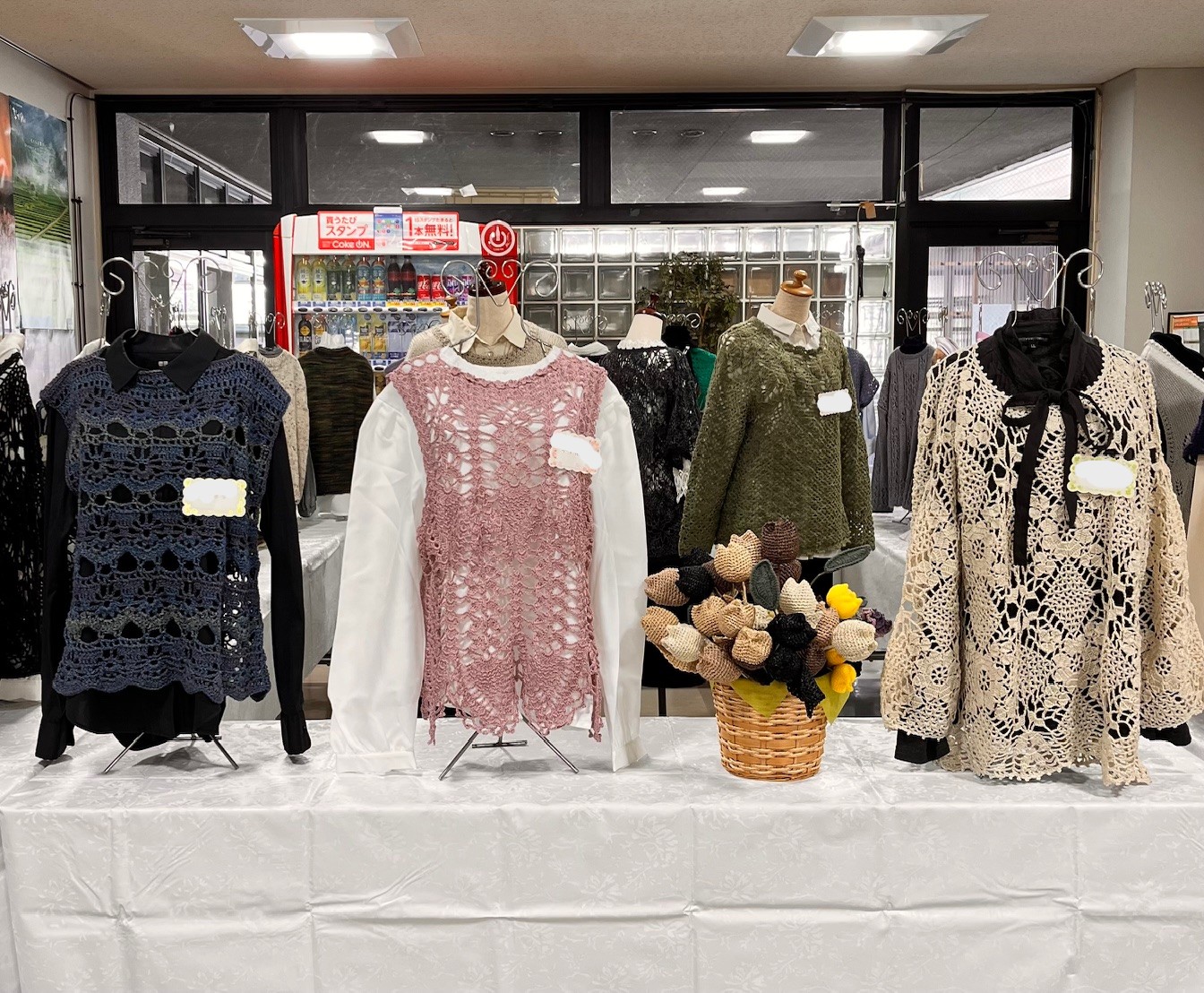 成人学校「初心者の手あみもの」講座の作品展示が始まっています